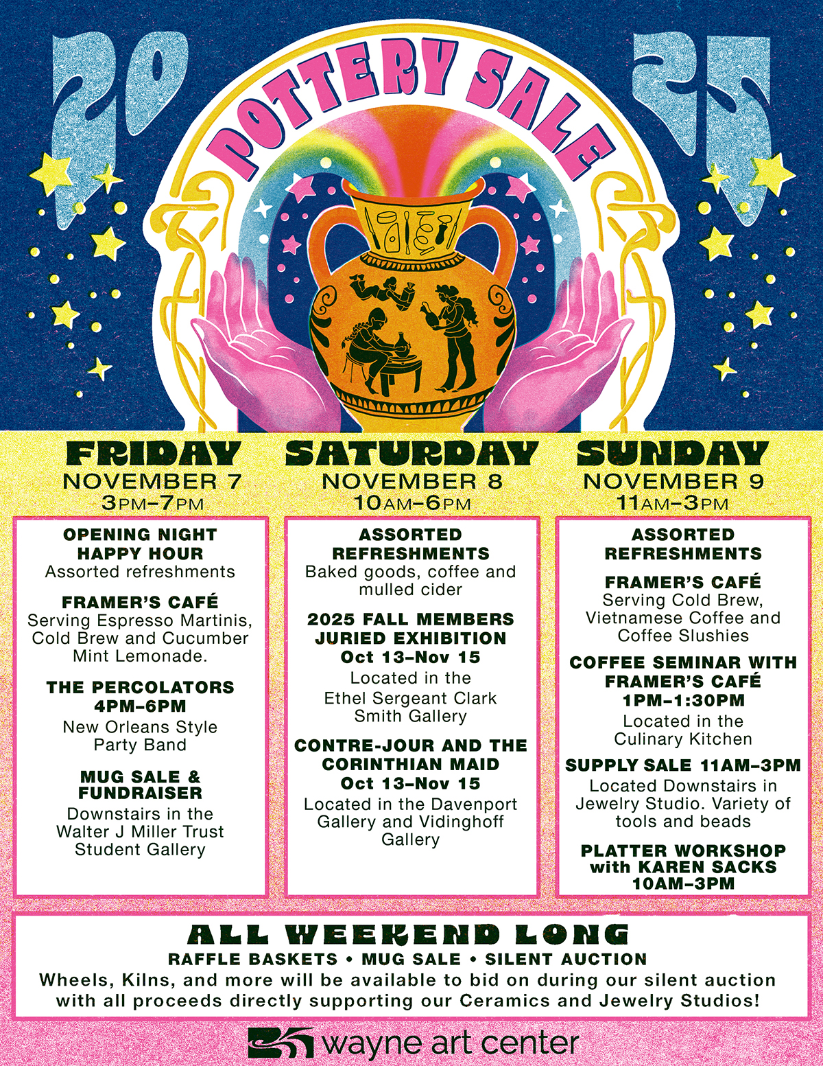 November marks the annual Wayne Art Center Pottery Sale and Studio Fundraiser, celebrating its fourth year. The weekend long festivities commence on Friday, November 7th from 3pm to 7pm with the Opening Happy Hour that includes Espresso Martinis, Cold Brew and Cucumber Mint Lemonade courtesy of Framer’s Café. The entertainment for the evening will be live music from The Percolators, a New Orleans style party band from 4pm to 6pm. Ceramic wares and Raffle baskets will be on display throughout the building. Door open early on Saturday with the continuation of ceramic sales from 10am to 5pm on November 8th. The weekend’s events conclude on Sunday, November 9th from 11am to 3pm with the Studio Supply Sale with a variety of pottery tools, glass working tools and Jewelry making equipment. Framer’s Cafe will be offering Cold Brew, Vietnamese Coffee and Coffee Slushies and will be conducting a Coffee Seminar from 1 to 1:30 pm. In addition to a large selection of local artists’ handmade ceramics for sale, there will be raffle baskets and 50/50 tickets for purchase, a mug sale featuring the work of Wayne Art Center ceramic students, and a studio equipment Silent Auction. As always, Studio tours and information on upcoming ceramic classes and workshops will continue through the weekend. Please visit wayneart.org for upcoming exhibitions including CraftForms 2025, 30th International Juried Exhibition of Contemporary Fine Craft, Living with Craft, and Attraction to Abstraction will be on view at Wayne Art Center located at 413 Maplewood Avenue, Wayne, PA 19087.