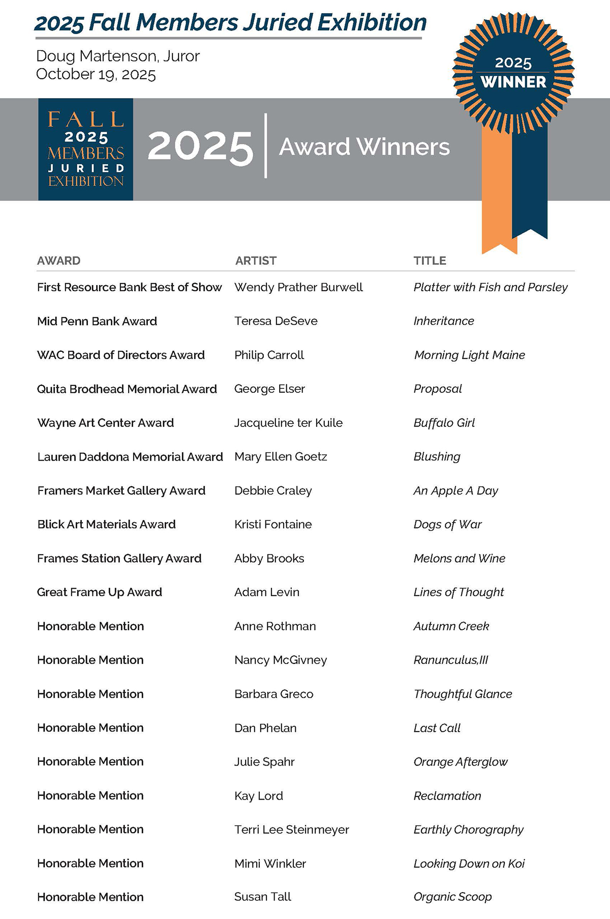 Each year Wayne Art Center celebrates the outstanding artistic talent and creativity of our members during WAC’s annual Fall Members Juried Exhibition. WAC’s 2025 Fall Members Juried Exhibition showcases the talent within our membership with works in all mediums including painting, drawing, works on paper, mixed media, sculpture, ceramics, metal, glass, fiber, jewelry, photography and Digital Technology.