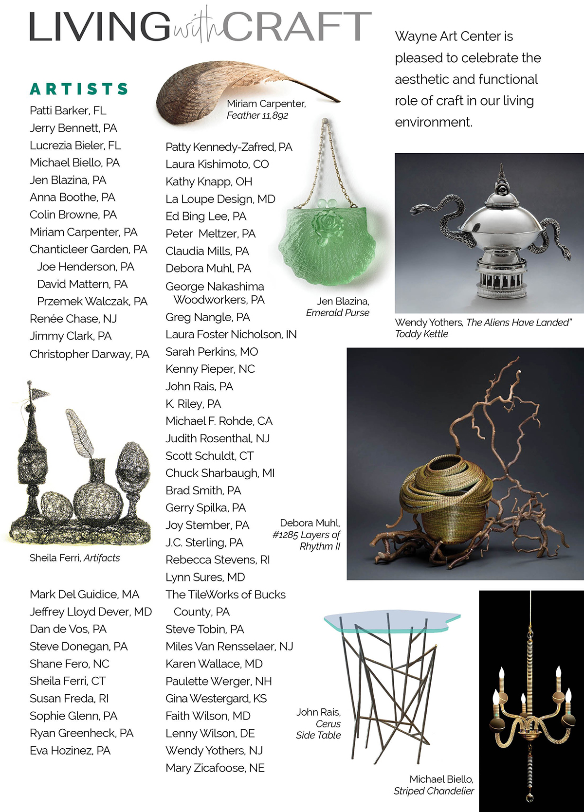 Wayne Art Center is pleased to showcase Living with Craft, an electric collection of contemporary craft featuring a diverse range of mediums that represent and celebrate the aesthetic and functional role of craft in our everyday environment.